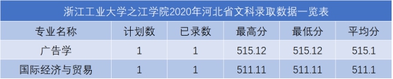 近日,我院2020年河北省普通类招生计划一次性圆满完成,计划招生10个,实际录取10个。其中,文史类计划招生2个,实际录取2个,广告学专业录取分515.12分;国际经济与贸易录取分511.11分。