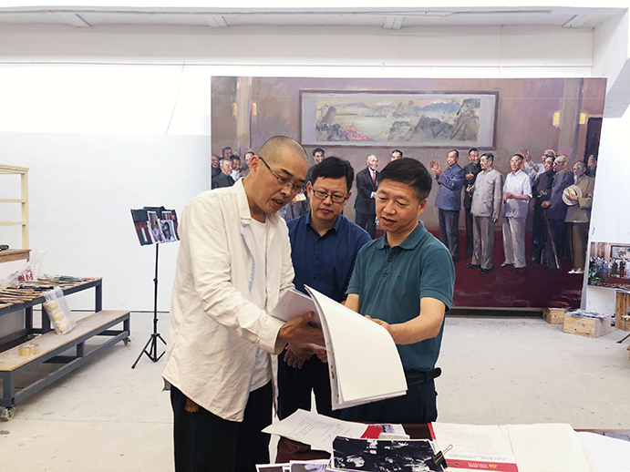 近日,学院党委书记彭松波、杭州富阳区文化与广电旅游体育局副局长陈明前往建筑学院教师卢家华工作室参观走访。2018年10月,卢家华受邀参加“不忘初心、继续前进”——庆祝中国共产党成立100周年大型美术创作工程,他和杨参军先生创作的《李宗仁回国》从全国两千多名作者的作品中脱颖而出,入选了该重大的工程。目前,该作品的创作已进入尾声,彭松波对我院教师能参与到国家级美术创作项目工程中表示鼓励和支持,点赞了卢家华老师展现自己艺术专业特长、展现艺术为人民服务的精神和理念。