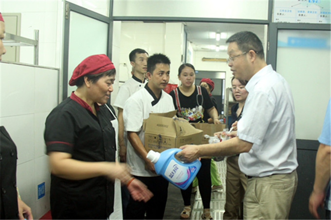 慰问现场,陈金友一行向暑期奋战在工作岗位上的后勤员工们表示亲切的慰问和感谢,叮嘱大家在工作中注意防暑降温,加强安全防护,避免出现中暑现象,同时要求大家坚守岗位、克服困难,不断做好后勤服务工作,确保暑期学院安全稳定,保证留校师生渡过一个愉快充实的暑假,并为迎接新学期的到来做好充分准备。