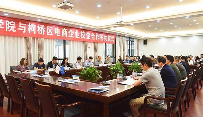 4月26日,我院与柯桥区电商企业举行校企合作签约仪式。学院党委副书记黄新敏、浙江明牌珠宝股份有限公司副总经理曹国其、绍兴沐家家居科技股份有限公司总经理杨君出席会议,柯桥区商务局相关负责人,学工部、团委、教务部、创新创业学院等职能部门和二级学院学生工作负责人,优秀电商企业代表,师生代表共计50余人参加了签约仪式。
