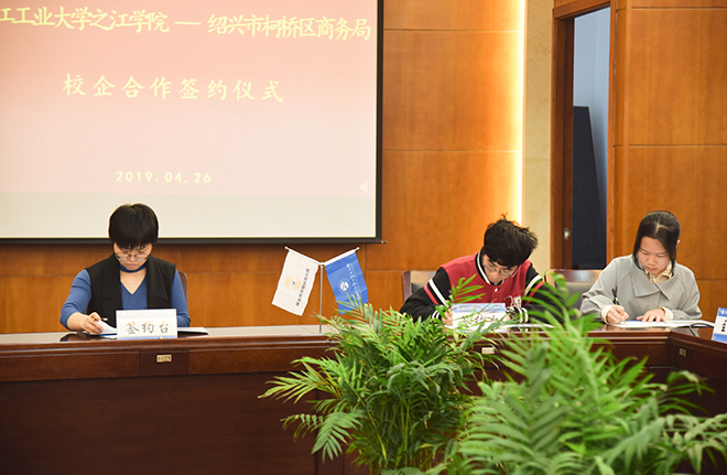 签约仪式上,商学院、外国语学院与中国珠宝品牌龙头企业浙江明牌珠宝股份有限公司、绍兴知名企业绍兴沐家家居科技股份有限公司、优秀电商企业浙江通纺云电子商务有限公司签署校企合作协议。电子商务、英语专业学生代表与蒲公英集团、浙江元一家居用品集团有限公司签署见习实习意向协议。