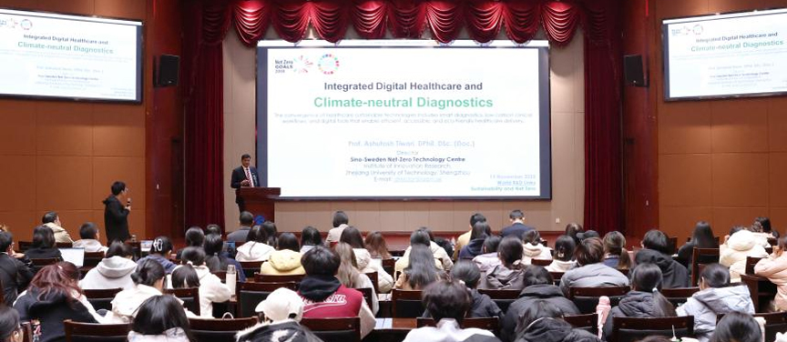 Tiwari教授系统阐述了以“集成式数字医疗与气候中和治理”为核心的发展路径,提出通过智能诊断、数字化平台与低碳临床路径的创新融合,实现医疗流程的绿色重塑。他深入剖析了智能传感、可穿戴设备与环境友好型诊断系统的协同创新机制,展示了多项前沿研究成果在疾病早期预警与可持续医疗中的应用潜力,引发在场师生对绿色科技与健康未来深度融合的深刻思考。