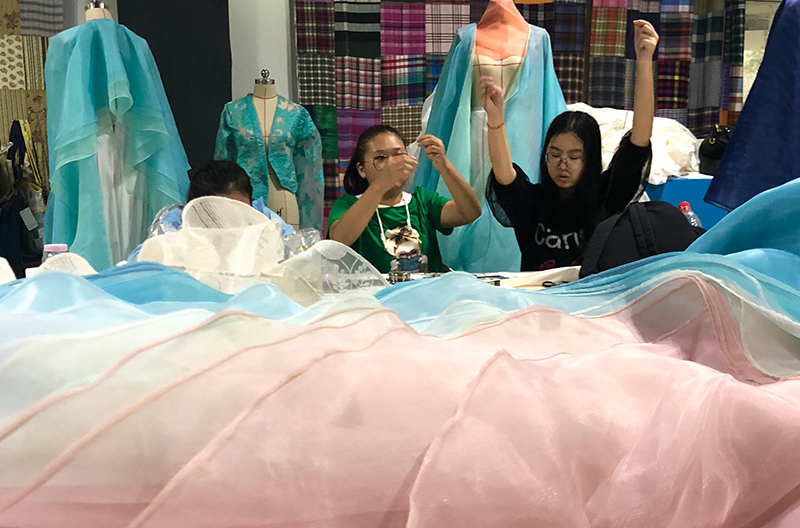 礼服制作过程中,裘海索教授带领学生一起创作,指导学生实践
