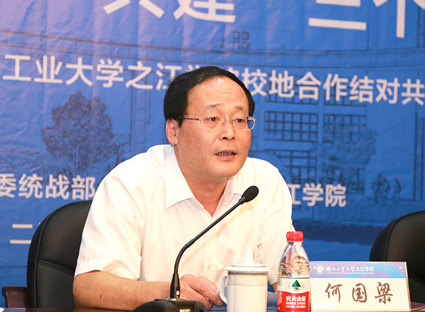 何国梁在结对仪式上指出:民主党派资源丰富一直是柯桥区引以为傲的“资本”之一,之江学院落户柯桥区,为柯桥区经济社会发展再添一翼。柯桥区民主党派成员企业与之江学院本着“优势互补、资源共享、互惠双赢、共同发展”的原则,开展深入合作,精准对接,有利于充分发挥高校教育智力系统性密集化和企业实训实践空间大、机会广的优势,建立起校地双方长期紧密合作关系。他在结对仪式上提出四个“共同致力”,以期构建统战工作的新格局:一是共同致力发挥统一战线的重要法宝作用;二是共同致力推动绍兴、柯桥经济社会跃升发展;三是共同致力开创校企合作的柯桥模式;四是共同致力加强党外代表人士培养选拔使用。
