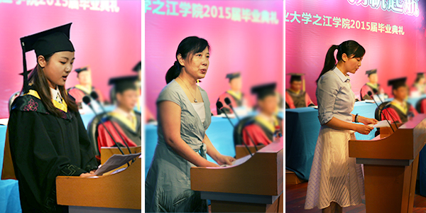 毕业生代表(左)、毕业生家长代表(中)、教师代表(右)在典礼上发言