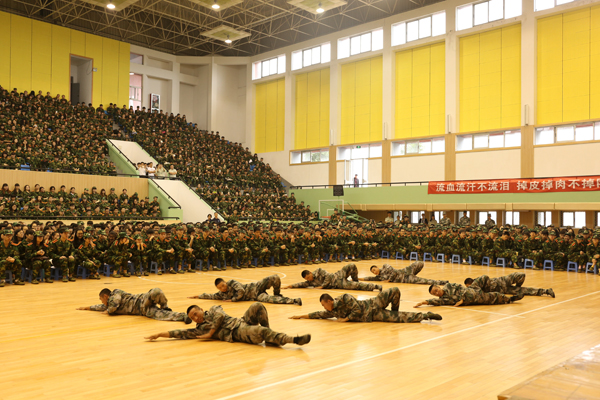 动员大会上,驻训官兵做了队列、格斗示范表演,他们整齐的动作和精湛的格斗技术赢得了现场参训学生阵阵掌声。2015年来我院驻训的教官共41名。本次军训工作由军事技能训练和军事理论课两部分组成,训练时间为7月4日至7月18日,为期15天。