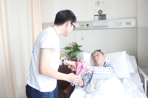 7月22日,实践队马不停蹄地来到上海市第一人民医院,看望正在这里接受治疗的又一位抗战老兵王纯。王老曾是杭州船舶工业学校(浙江工业大学之江学院前身)的副校长,今年已93岁高龄。郑雅萍关切地询问了老人的身体情况,并向老人介绍了学院的发展情况,还代表学院送上了慰问金和鲜花。看到学院领导和大学生来,老人十分高兴,当听到学院如今所取得的发展成果,王老脸上露出了灿烂的笑容。