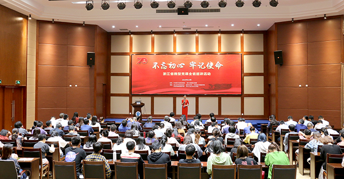 10月14日, 由中共浙江省委宣传部、浙江日报报业集团主办的“不忘初心,牢记使命”浙江省微型党课全省巡讲活动在学院举行。学院党委书记郑雅萍、共产党员杂志社采编二部主任俞亦赟,绍兴市委宣传部宣教处副处长沈露斌、柯桥区委宣传部相关负责同志以及学院党总支书记、副书记,党支部书记,组织员,机关全体党员和学生党员代表等近300人参加了活动。