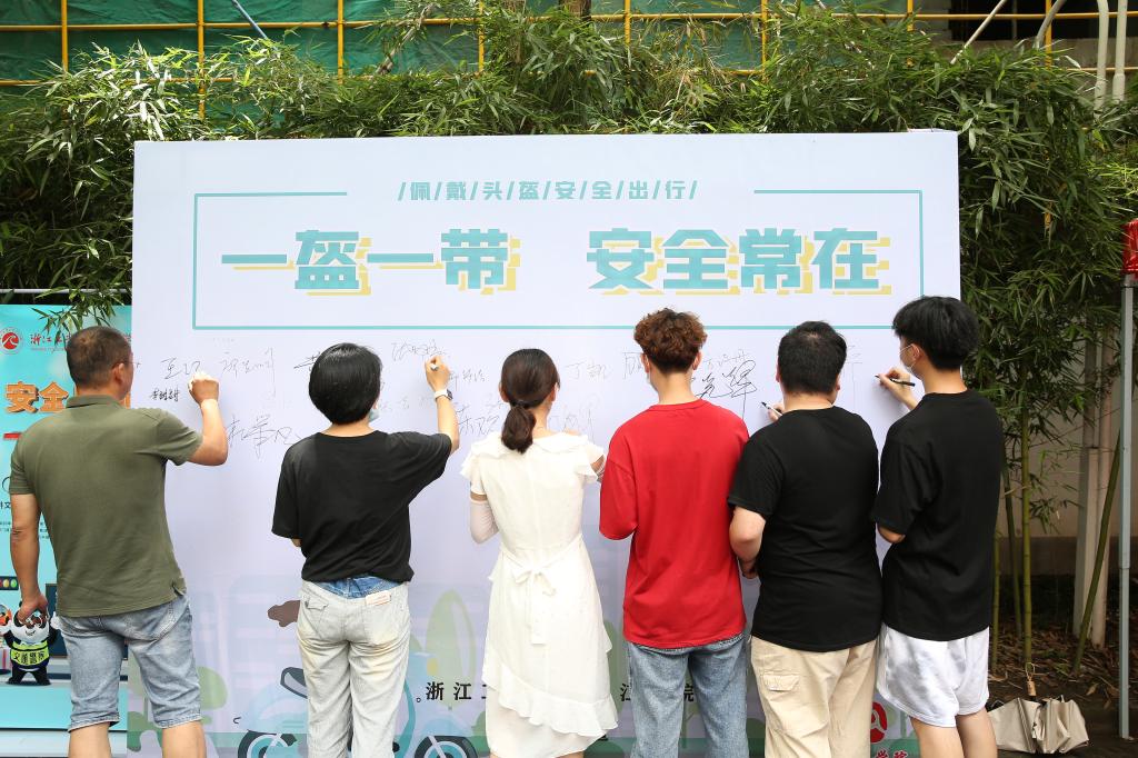 6月11日中午,交通安全宣传周活动启动仪式于学缘堂门口隆重举行,柯桥交警中队应邀参加活动。学生志愿者们在活动现场分发宣传资料,倡导骑行电动车需佩戴安全头盔,不得骑车带人,在校内营造自觉佩戴安全头盔,文明行车的良好风尚。交警在学院主干道针对不佩戴安全头盔、骑电动自行车带人等违章行为进行现场安全教育,引导大家筑牢交通安全意识,抵制交通陋习,自觉遵守交通法律法规;同时在活动现场指导师生正确佩戴头盔,并现场赠送安全头盔,通过与师生积极互动,让师生了解了如何正确戴头盔。本次活动得到了师生员工的积极响应,他们纷纷表示愿意加入“电动车安全文明出行劝导”行列,决不做有损校园文明的行为,并在“一盔一带 安全常在”主题倡议大型喷绘上签名。