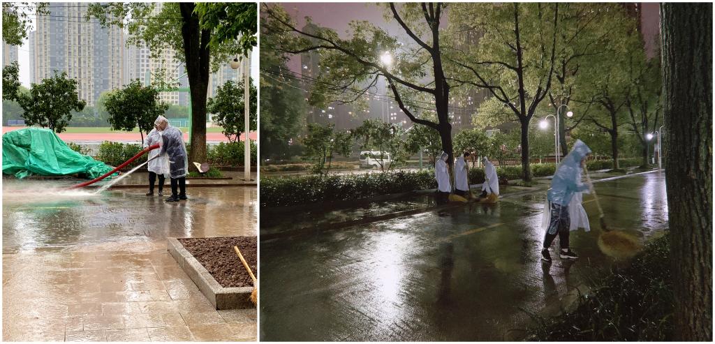 图:教学区服务部连同各部门骨干日以继夜地对校园所有道路进行冲洗、清洁