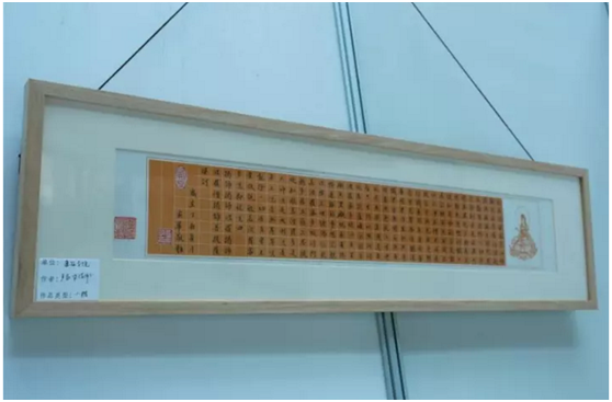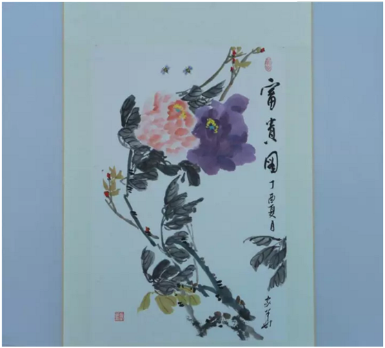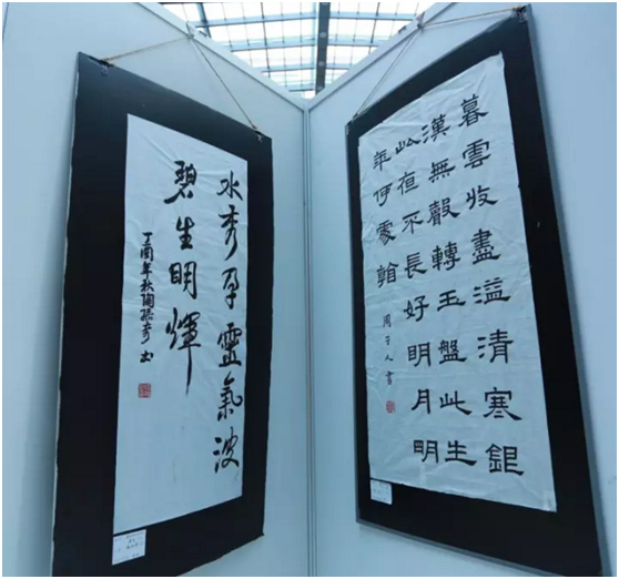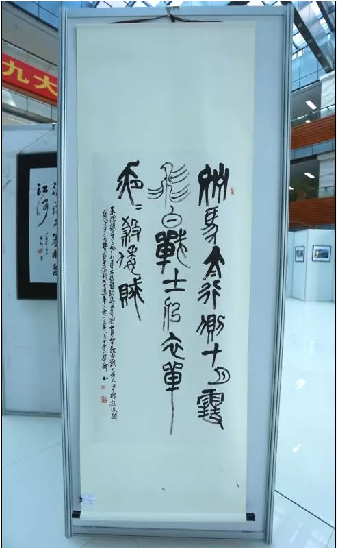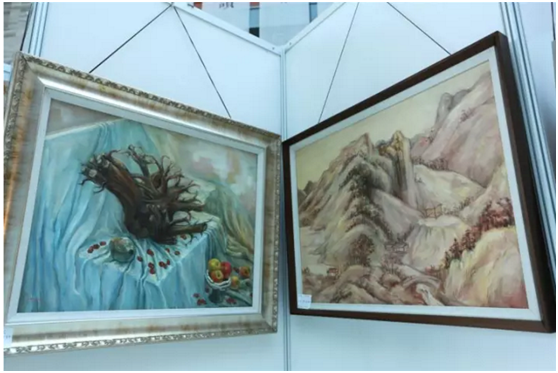钱华根老师的小篆书法作品写的是朱德将军的诗:“伫马太行侧,十月雪飞白,战士仍衣单,夜夜杀倭贼”,小篆线条自由,整幅字以泼墨的形式,气势雄伟,又不失其笔法,艺术效果强烈,壮观,气魄。反映了中国共产党为了民族解放,带领全国人民不畏艰难困苦的革命乐观主义精神。曲哲老师的水彩风景画描绘了现代农家住宅的大气和优美,屋旁小桥流水,人与自然的和谐相处,让人感觉到如今的生活水平达到了很高的程度。