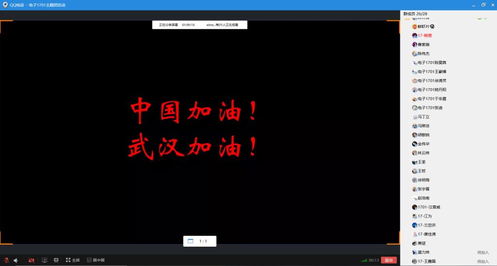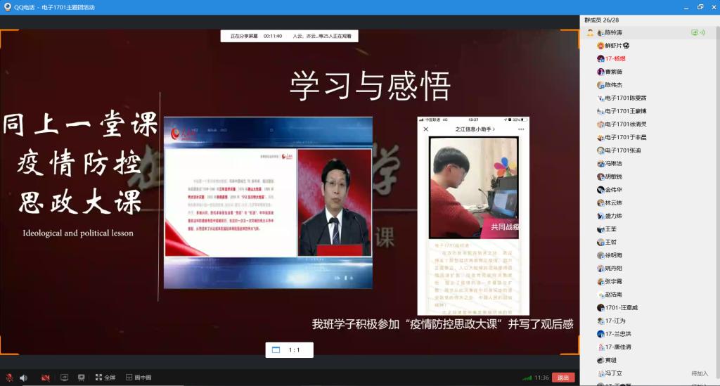 3月18日上午,信息工程学院电子1701团支部举行以“之江人 共抗疫”的为主题线上团日活动。之江学院团委书记、班主任王荃老师、任课教师陈伟杰老师、信息学院团委书记和电子1701团支部全体成员参加了这次线上团日活动。本次主题团日活动重点探究电子信息工程专业未来专业的发展、就业方向及本次抗疫行动青年志愿者能做些什么等议题。