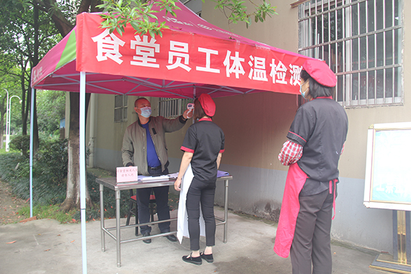 一落实从业人员健康管理。返岗前进行动态跟踪监测,符合防疫条件的人员方准予返岗;返岗时进行再摸排、再核实,落实持证(健康证)上岗制,返岗后进行“一日两测”体温管控制,确保人员无“症”上岗;要求疫情区域人员进行核算血清检测,检测通过者,再持健康证上岗。二落实清洁消毒工作。对后厨过道、大厅地面、室内门窗、就餐桌椅、一卡通设备等公共区域及设施进行全面清洁消毒;对餐具、厨具进行高温蒸煮消杀,确保餐餐清洁、顿顿消毒。三落实食材安全管控。严把采购渠道关、进货查验关、储存安全关、操作规范关,严格落实定点专人采购、索票索证、进货查验、食品留样制度。四落实就餐防控管理。开展了餐桌隔板摆放布局、张贴防控提示标识、提供免洗手液、安排就餐引导员、分批错峰就餐等多项防控措施,打餐保持1米左右安全距离,用餐实行同向错位就座,提倡自带餐具、打包带走,确保防控工作有序、有力、有效。