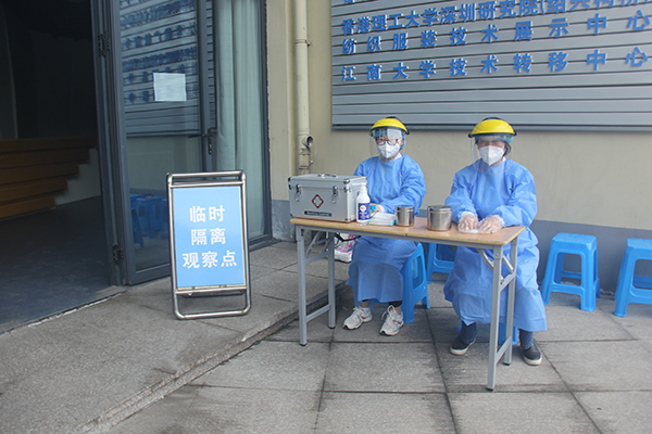 返校的第一天,清晨6点,由各部门青年骨干员工组成的行李消毒组已经早早地准备就绪,为每位返校的同学进行行李消毒。大门口医务隔离点的医护人员也已经早早就位,随时做好应急准备。