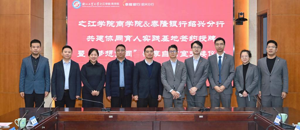 11月26日,商学院与泰隆银行绍兴分行在行健楼215举行共建协同育人实践基地签约仪式暨“梦想空间”共享自习室交接仪式,学院党委副书记王绍让,泰隆银行绍兴分行党委书记、行长李阳,泰隆银行总行企划部品牌文化中心主任徐赟,泰隆银行绍兴分行相关负责人,学生工作部相关负责人,商学院党政班子成员以及师生代表参加仪式。