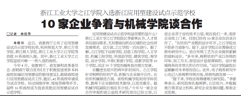 绍兴晚报2016-1-17:浙江工业大学之江学院入选浙江应用型建设试点示范学校