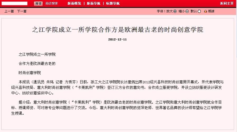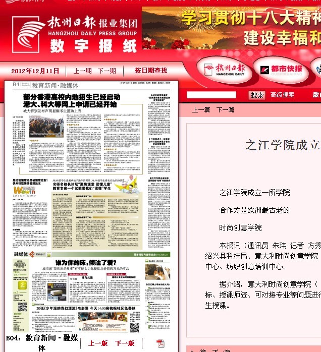 杭州日报(B4教育新闻)2012-12-11:之江学院成立一所学院合作方是欧洲最古老的时尚创意学院