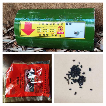 三、投放药饵:本次灭鼠使用的药物分为0.005%溴鼠灵及0.01%溴敌隆杀鼠剂两种,警告色为蓝色。