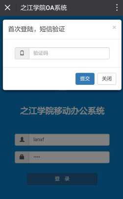 3、输入账号密码,账号密码与电脑上办公系统一样(注:账号用英文,姓的全拼 名的首字母),首次登录需要短信验证,如下图所示