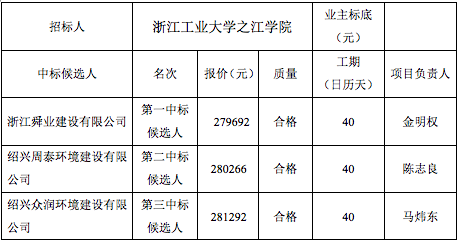浙江工业大学之江学院体育馆内舞台背景立面装饰工程,于2018年7月16日在绍兴市柯桥区越州大道958号浙江工业大学之江学院行健楼111室公开开标,按招标文件规定的评标办法,已确定第一、第二、第三中标候选人,现将有关内容公示如下: